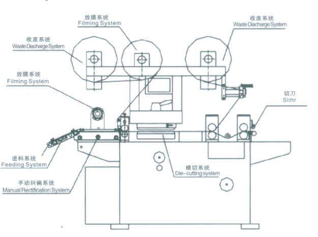 獨立放料帶貼合,該機集放料,多層貼合,局部 貼合,多條膠帶貼合,貼合膜收底紙(剝離)采, 用進口電機放料,復膜,模切,排廢,切片,收 卷,由電腦全程控制一次完成